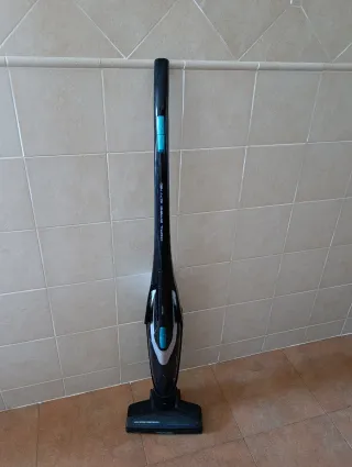 Aspiradora escoba de diseño moderno en color negro con detalles en azul. - Mango ergonómico. - Base con cepillo. - Cuerpo estilizado.