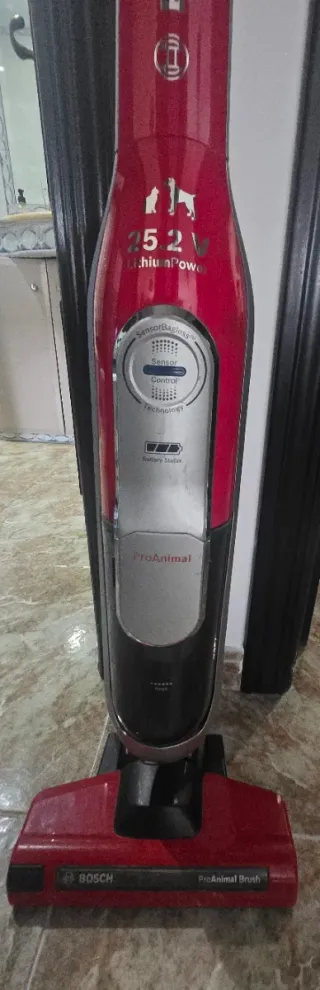 Aspirador escoba Bosch de 25.2V, modelo ProAnimal. - Color rojo y negro. - Tecnología LithiumPower. - Indicador de estado de batería. -Con todos los accesorios La batería esta al 50%, da fallos