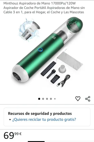 Aspiradora portátil Minthouz de mano, ideal para el coche, el hogar y mascotas. Potente succión de 17000Pa y 120W. - Diseño compacto y sin cable. - Incluye accesorios para diferentes usos. - Filtro lavable. - Puerto de carga USB.