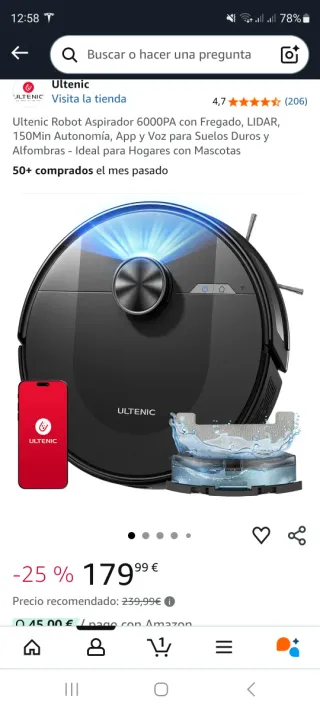 Robot aspirador y fregasuelos Ultenic en color negro. Ideal para suelos y alfombras. Está nuevo, sin sacar de su embalaje, ha sido un regalo y no puedo devolverlo. Por eso lo vendo. - Modelo 6000PA con LIDAR. - Autonomía de 150 minutos. - Control por App y Voz. - Diseñado para hogares con mascotas.
