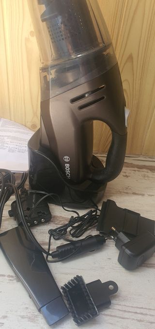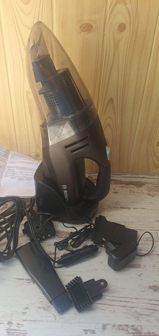 Aspiradora de mano Bosch en perfecto estado. Es compacta y fácil de usar. - Incluye varios accesorios para diferentes superficies. - Diseño elegante y moderno en color marrón oscuro. - Se entrega con su base de carga y todos los accesorios que se ven en las fotos.