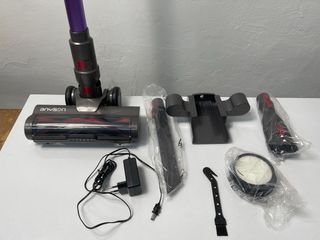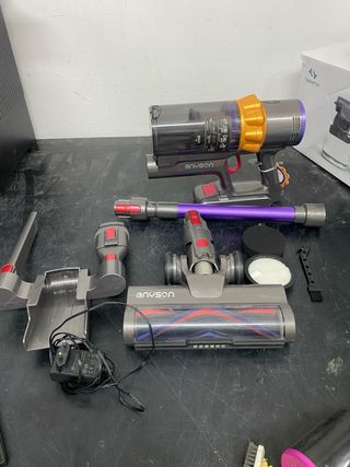Aspiradora vertical Anyson en color morado y detalles dorados. Incluye varios accesorios para una limpieza completa. - Cabezal de aspiración. - Tubo de extensión. - Base de carga. - Cargador de corriente. - Cepillo. - Accesorio para esquinas.