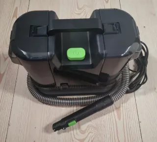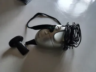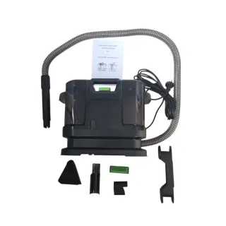 Aspirador compacto de color negro, diseñado para la limpieza de tapicerías. - Nuevo a estrenar. - Incluye manguera flexible. - Boquillas y cepillos con botón de activación.