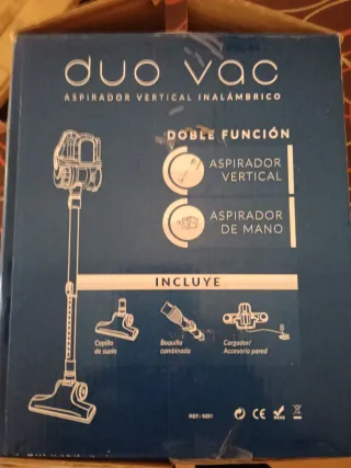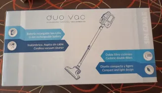 Aspirador vertical inalámbrico Duo Vac. - Incluye kit de accesorios: Cepillo suave, cepillo suciedad difícil, manguera extensible, tubo extensible ligero, adaptador para accesorios y accesorio mantenimiento. - Batería recargable Li-Ion. - Aspira sin cable. - Doble filtro ciclónico. - Diseño compacto y ligero.