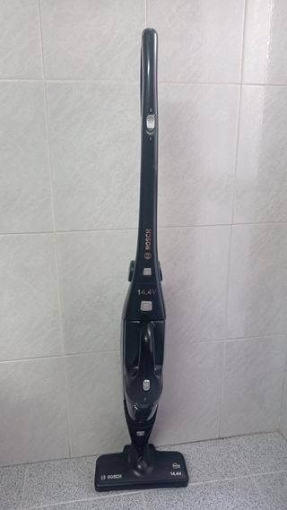 Aspiradora sin cable y sin bolsa Bosch mover 2 in 1, 14'4V. 3 kg de peso, autonomía de 15-20 minutos, carga 2-4 horas, cepillo extraíble y de muy fácil limpieza. Se mantiene en posición vertical por si misma. Con aspiradora manual extraíble. Diseño para limpieza de todo tipo de suelos, moquetas, tapicerías, alfombras, incluso el coche. Pequeño arañazo, se ve en la foto, no altera para nada sus funciones.