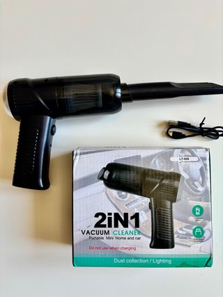 Aspiradora portátil recargable, ideal para el hogar y el coche. Su diseño compacto la hace fácil de manejar y almacenar. Tiene filtro de polvo que se puede extraer para su limpieza. - Función de aspiración. - Incluye cable de carga USB. - Dos boquillas, una de ellas tipo cepillo para suciedad incrustada. - Prácticamente nueva.