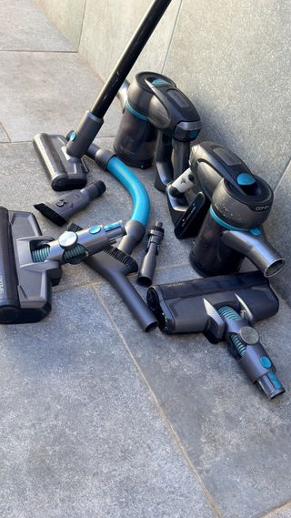 Aspirador inalámbrico de la marca Honiture. Tiene uso pero vamos bien. Incluye un tubo que se doblar por la mitad para aspirar debajo de sofa y muebles. - Tubo extensible. - Cabezal con cepillo. - Depósito transparente. - 3 filtros de repuesto mas otro que lleva puesto