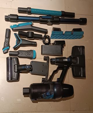 Aspirador Dayson V6, equipado con varios cepillos para diferentes tipos de trabajo. Es necesario cambiarle la batería ya que no aguanta,..