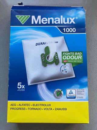 Pack de 3 bolsas para aspiradora Menalux 1000 - Tecnología DuraFlow - Combate el mal olor con Fresh Air Tech - Compatible con AEG, Alfatec, Electrolux, Progress, Tornado, Volta, Zanussi.
