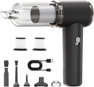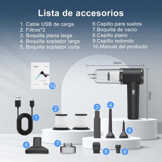 Mini aspirador de mano inalámbrico. Con 12000 Pa de fuerza de succión. Motor de 120 W. Ideal para eliminar migas, polvo y suciedad en alfombras, tapicerias, rincones del coche... Compacto. Función de aspirar/soplar/vacio. Filtros HEPA lavables. Carga USB-C. Autonomía de 30 minutos sin cable. Ligero.