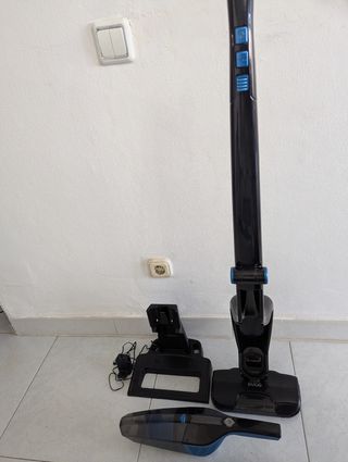 Aspiradora escoba 2 en 1 ideal para limpiar coche - Filtro lavable - Accesorios - Batería carga máximo y dura - Color negro y azul. - Incluye base de carga y cargador. - Luz LED frontal para iluminar la zona de limpieza. - Cepillo giratorio En buen estado