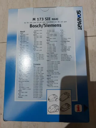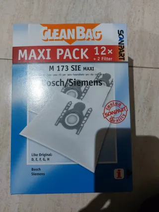 Pack de 12 bolsas para aspiradora, modelo M 173 SIE MAXI, compatibles con Bosch y Siemens. Incluye 2 filtros adicionales. Nuevo a estrenar - Marca: Clean Bag - Modelo: M 173 SIE MAXI - Compatibilidad: Bosch, Siemens (modelos D, E, F, G, H) - Incluye: 12 bolsas + 2 filtros