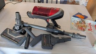 Aspiradora Dyson ROTA no carga, en color gris y morado, con varios accesorios para diferentes usos. - Incluye cargador. - Base de carga. - Cepillo. - Boquilla. - Tubo de extensión.