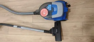 Aspirador de trineo con varios accesorios para una limpieza completa. Funciona perfectamente, pero mi madre prefiere los clásicos de recambio de bolsa de toda la vida. - Cuerpo principal en color gris y azul. - Manguera flexible negra. - Tubo telescópico plateado. - Cepillo principal. - Accesorio para ranuras.