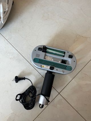Aspiradora escoba de color blanco, con un diseño moderno y ligero. - Mango ergonómico. - Base con ruedas para facilitar el movimiento. Está en perfectas condiciones se puede plegar y también sacar para aspirar en pequeños huecos Tiene su cargador con todo