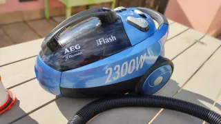 Aspiradora AEG de color azul con una potencia de 2300W y tecnología Cyclone. - Diseño moderno y compacto. - Incluye manguera y accesorios.