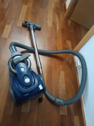 Aspirador sin bolsa de color azul. - Diseño compacto y moderno. - Manguera flexible para mayor alcance. - Ruedas para fácil desplazamiento.