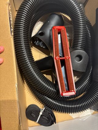 Aspiradora roja con manguera y accesorio
