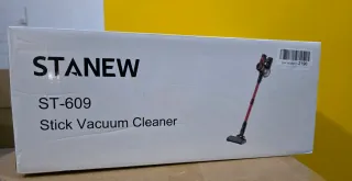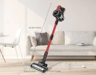 Aspiradora escoba inalámbrica Stanew ST-609 en color rojo y negro. Diseñada para una limpieza eficiente. - Altura total: 110cm (43.3in). - Ancho del cabezal: 23.5cm (9.3in). - Profundidad del cabezal: 15.5cm (6.1in). - Con todos sus accesorios.