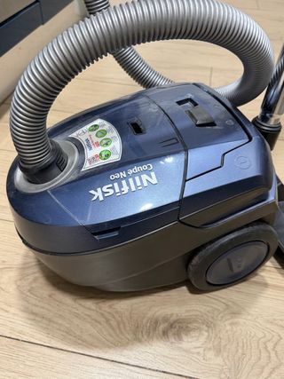 Aspiradora Nilfisk Coupé Neo en color azul. - Diseño compacto y ligero. - Manguera flexible para mayor alcance. - Ruedas para fácil movilidad. - Accesorios sin apenas uso Entrega en mano