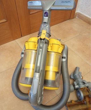 Aspiradora Dyson de color amarillo, con un diseño vertical y sistema de ciclones, se nota mucho el uso, funciona bien. - Incluye tubo rígido y manguera flexible. - Depósito transparente para el polvo. - Accesorio para suelos duros.