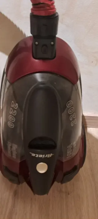 Aspiradora Ariete de color rojo y negro, con una potencia de 2200W. Es un modelo sin bolsa, lo que facilita su mantenimiento. - Diseño moderno y compacto. - Manguera flexible para mayor comodidad.