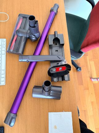 Aspirador Dyson V6 Animalpro en color morado y gris. - Tubo de extensión. - Cabezal motorizado. - Cepillo para suciedad difícil. - Soporte de pared. - Sólo los accesorios , completos y nuevos !!!