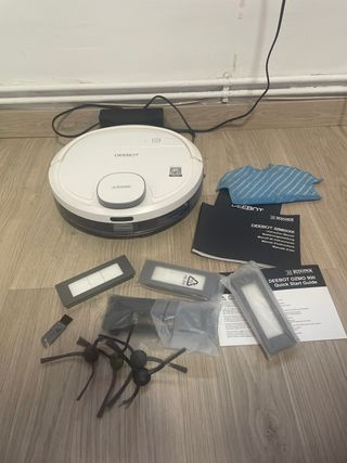 Robot aspirador de la marca Ecovacs, modelo Ozmo 900. Incluye accesorios. - Base de carga. - Cepillos laterales. - Filtros de repuesto. - Paño de limpieza. - Manuales de instrucciones. Funcionando perfectamente! Ecovacs es una prestigiosa marca en sistemas de aspiración, de hecho, los famosos Roomba incorporan dichos sistemas