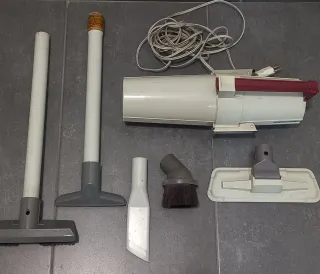 Aspirador de la marca Moulinex, un modelo clásico con un diseño retro. Años 60/7 FUNCIONA. - Incluye varios accesorios para diferentes usos. - Cuerpo principal de plástico en color blanco y burdeos. - Cable de alimentación enrollable.
