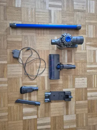 Aspirador Dyson V6 Fluffy con varios accesorios. - Tubo de extensión azul. - Cabezal motorizado y luz led. - Cargador. - Cepillo pequeño. - Boquilla estrecha. - Soporte de pared. El aspirador ha sido usado y en su momento se cambió bateria y cepillo. El aspirador funciona correctamente, quizas la bateria dura un poco menos que de nueva pero funciona.
