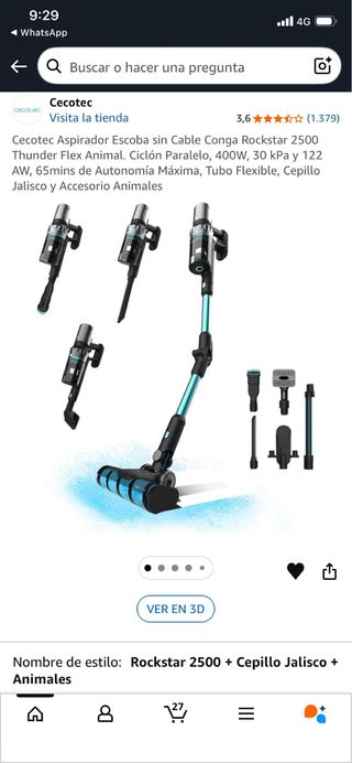Aspirador escoba Cecotec Conga Rockstar 2500 Thunder Flex Animal. - Ciclón Paralelo. - 400W de potencia. - 30 kPa y 122 AW de succión. - 65 minutos de autonomía máxima. - Tubo flexible. - Incluye cepillo Jalisco y accesorio para animales. Prácticamente sin uso.
