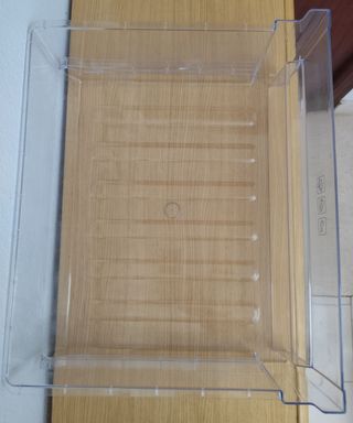 Cajón transparente para frigorífico Beko, diseñado para frutas y verduras. Ancho:49 cm x Alto: 15.5 cm x Fondo:39.5Cm - Material: Plástico transparente. - Símbolos de uso en el frontal.