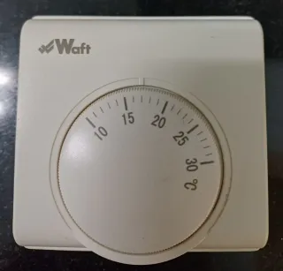 Termostato mecánico de la marca Waft para control de temperatura. - Diseño blanco. - Dial giratorio con escala de temperatura en grados Celsius (°C). - Indicadores numéricos para 10, 15, 20, 25 y 30 °C.