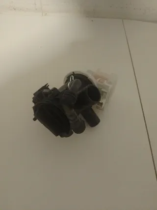 Bomba de agua para lavadora Balay. Pieza de repuesto. - Conexiones de entrada y salida. - Carcasa de plástico negro y blanco.