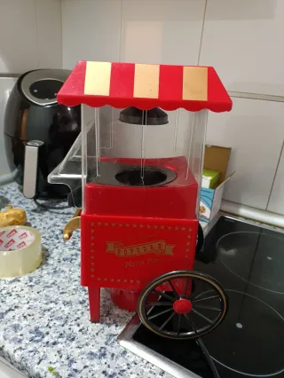 Máquina eléctrica para hacer palomitas con un diseño divertido y llamativo. - Color rojo vibrante. - Techo a rayas rojas y doradas. - Asa dorada frontal.