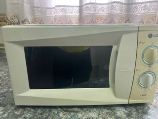 Microondas LG en color blanco, con función grill. Controles giratorios para ajustar la potencia y el tiempo. En perfectas condiciones. Recogida en Badajoz capital - Marca: LG - Color: Blanco - Controles: Dial de potencia (Watt) y dial de tiempo/función (Min/Grill).