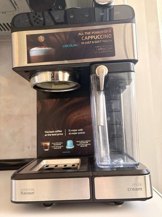 Cafetera semiautomática Cecotec para preparar deliciosos cappuccinos. - Diseño moderno con acabado plateado y negro. - Depósito de agua y leche extraíble. - Indicadores de nivel de agua. - Bandeja de goteo. - Botones intense flavour y milk cream. Casi nueva! Si necesitas mas información o fotos, no dudes en escribirme :)