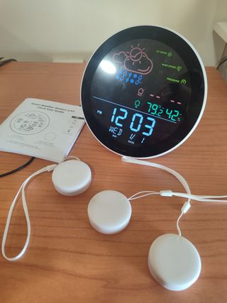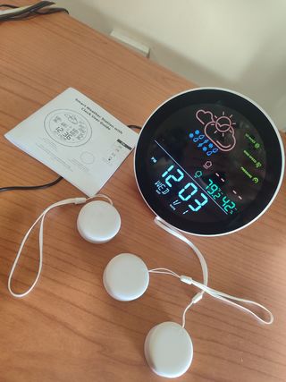 Estación meteorológica inteligente con reloj. Incluye 3 sensores inalámbricos. Está en perfecto estado. - Muestra la hora, fecha, temperatura, humedad, presión atmosférica, velocidad del viento y índice UV. - Pantalla LCD de alta resolución. - Diseño moderno y compacto. - Fácil de usar.