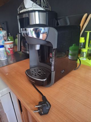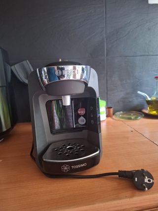 Cafetera compacta y elegante de la marca Bosch, modelo Tassimo. - Diseño moderno en color negro. - Ideal para preparar bebidas calientes.