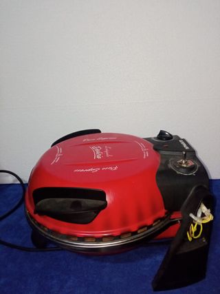 Horno para pizza rojo de la marca Ferrari, modelo Delizia. - Diseño compacto y redondo. - Indicadores de advertencia de superficie caliente. - Control de temperatura y temporizador.