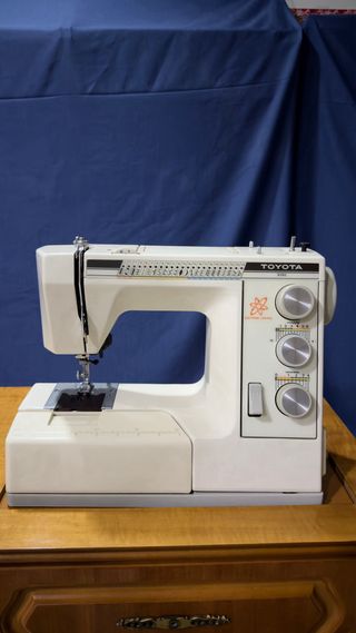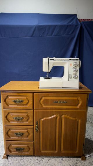 Máquina de coser electrónica Toyota, ideal para tus proyectos de costura. - Diseño compacto y funcional. - Acabado en color blanco y detalles plateados. - Incluye mueble de madera con cajones y puerta.