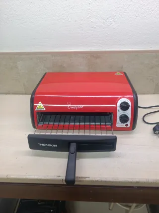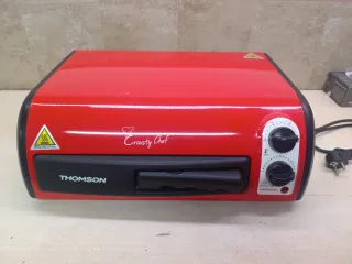 Horno de pizza Thomson de color rojo, con diseño moderno y compacto. - Frontal negro con asa. - Dos mandos giratorios para temperatura y tiempo. - Indicador de Crousty Chef.