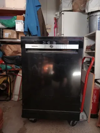 Lavavajillas de color negro con panel de control plateado. - Diseño moderno. - Panel de control con botones. - Ruedas para fácil movilidad.