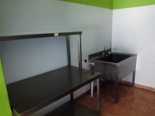 Conjunto de mobiliario de acero inoxidable para hostelería, ideal para cocinas profesionales o establecimientos de restauración. - Mesa de trabajo con estante superior. - Fregadero industrial de gran capacidad con grifo.