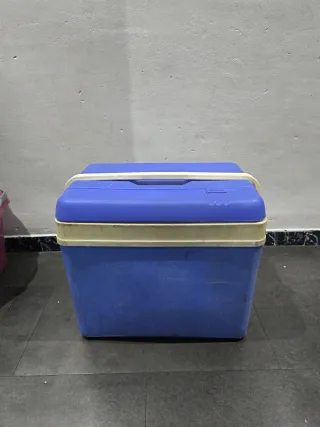 Nevera portátil de color azul y blanco, con un asa para facilitar su transporte. - Diseño práctico y funcional. - Ideal para mantener tus bebidas y alimentos frescos.