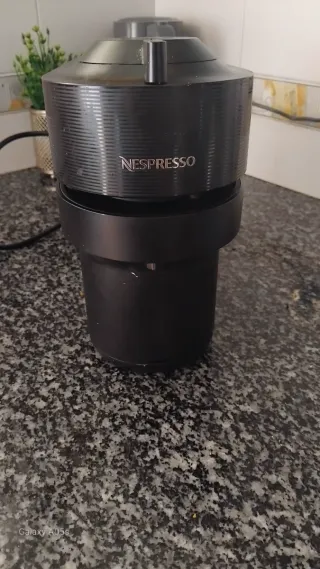 Cafetera Nespresso de color negro, con un diseño moderno y compacto. - Depósito de agua transparente. - Bandeja recogegotas extraíble.