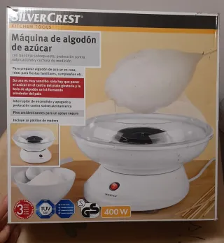 Máquina de algodón de azúcar Silver Crest, ideal para preparar dulces en casa. Incluye bandeja, protección contra salpicaduras y cuchara medidora. - Interruptor de encendido/apagado. - Protección contra sobrecalentamiento. - Pies antideslizantes para mayor estabilidad. - Incluye 10 palillos de madera. Nuevo a estrenar. En la última foto se ve que funciona, lo he sacado de la caja solo para comprobarlo.