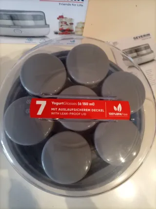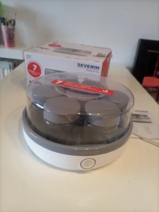 Yogurtera SEVERIN en perfecto estado, como nueva. Incluye 7 tarros para preparar tus yogures caseros. - Diseño moderno en blanco y gris. - Tapa transparente para ver el proceso. - Fácil de usar y limpiar.