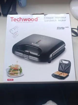 Sandwichera Techwood modelo Croque Monsieur, a estrenar ya que me tocó en un sorteo. - Potencia de 800W. - Diseño compacto y moderno. - Indicador luminoso de encendido/listo. - Modelo: TCM-806.