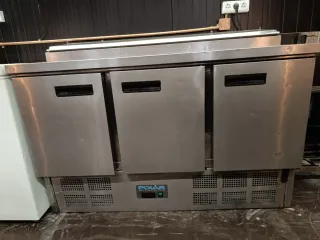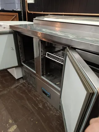 Nevera de acero inoxidable con tres puertas, ideal para ingredientes. - Diseño moderno en acero inoxidable. - Bajo mostrador con 3 puertas - Superficie de trabajo de 36cm x 137cm - Espacio para ingredientes de 130cm x 25cm - En perfecto funcionamiento